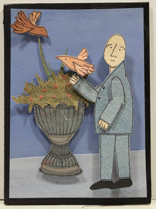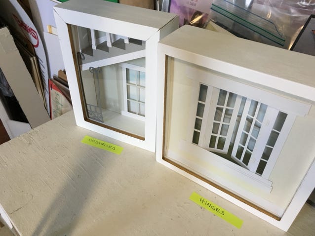 Using colored paper, scissors, glue, and a few found objects, Elizabeth has created two different series of small whimsical shadow box artworks.