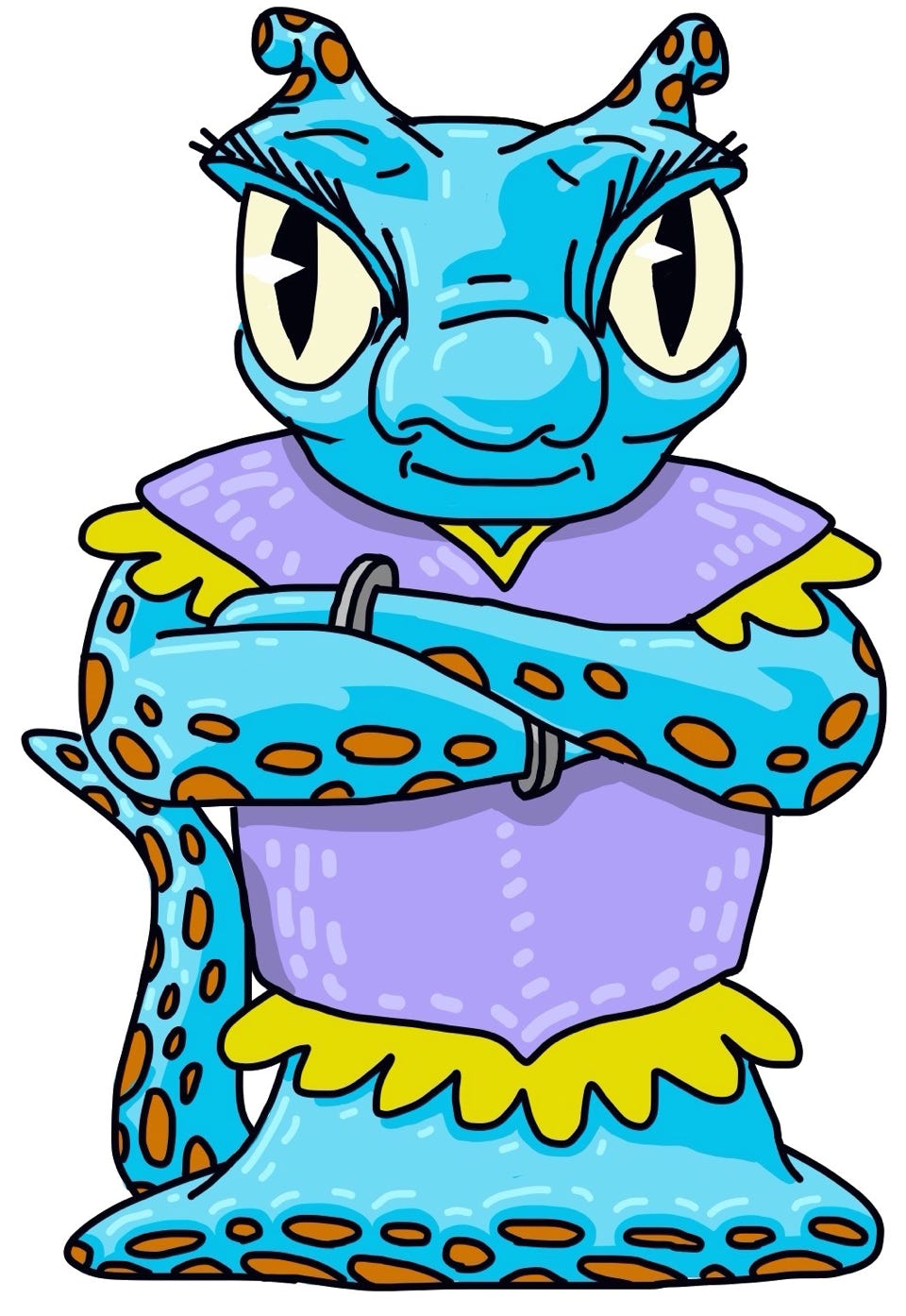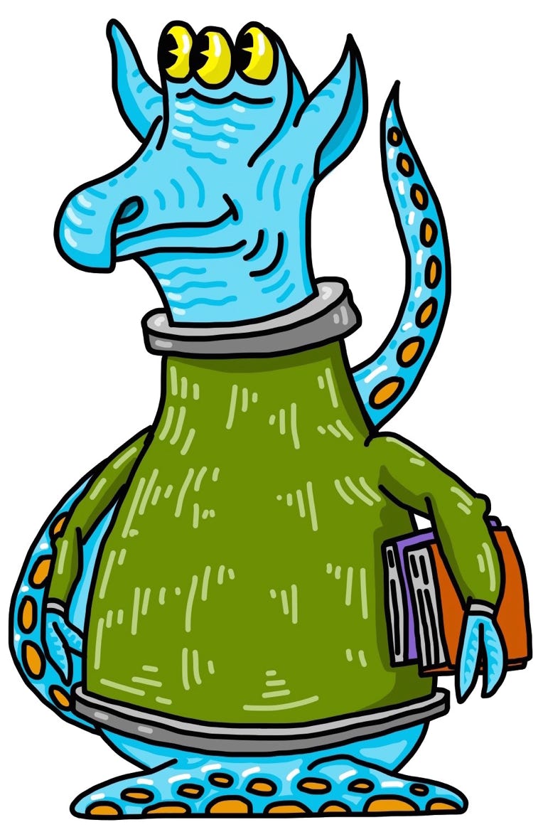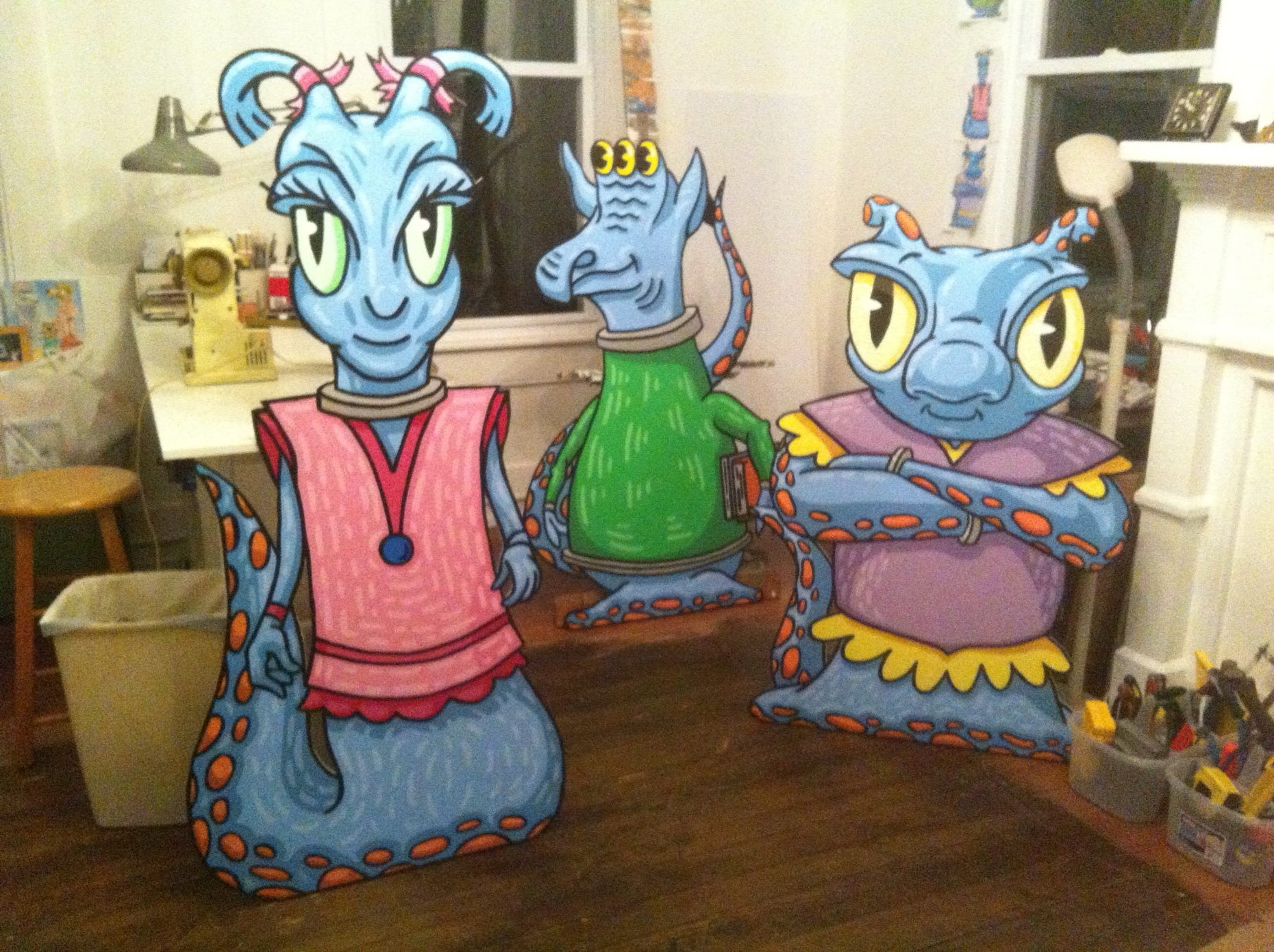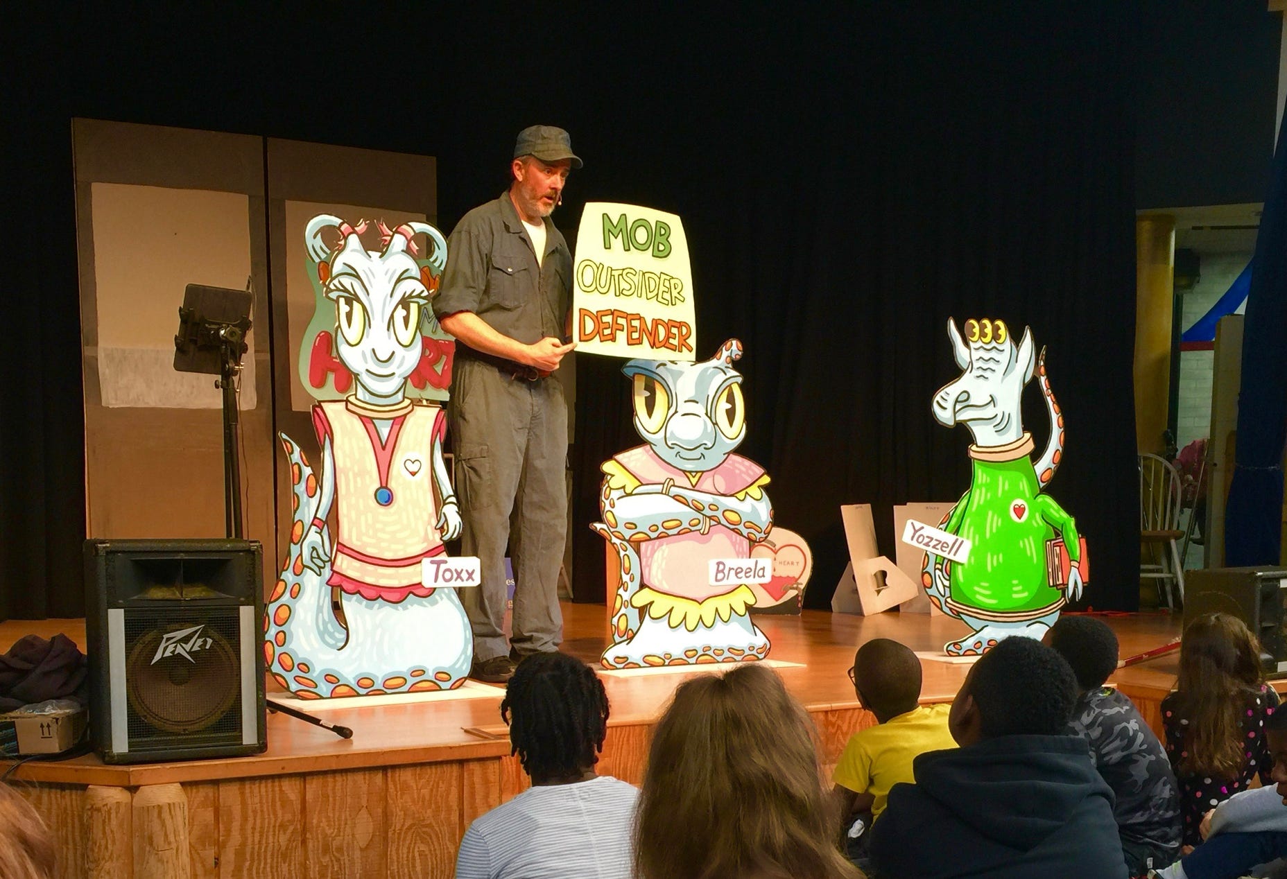 Above: the characters drawn and painted onto coroplast sign-maker’s material in the art studio, 48-60”; Below: The characters onstage in Alden’s performance A Window in My Heart, 2016. The assembly addresses the issue of bullying using these alien characters. Alden plays the custodian who tells the story.
